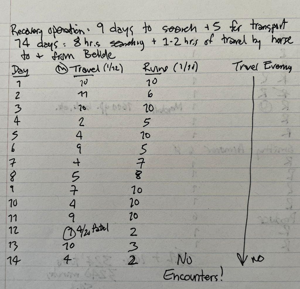 On the surface the PCs regroup and carefully proceed with Primeau back to town (Bellde). There are no encounters on the way back. This was a good reminder for the group about how quickly things can go bad. And Primeau was very lucky not to have taken more damage. He really needs to reach level 2.